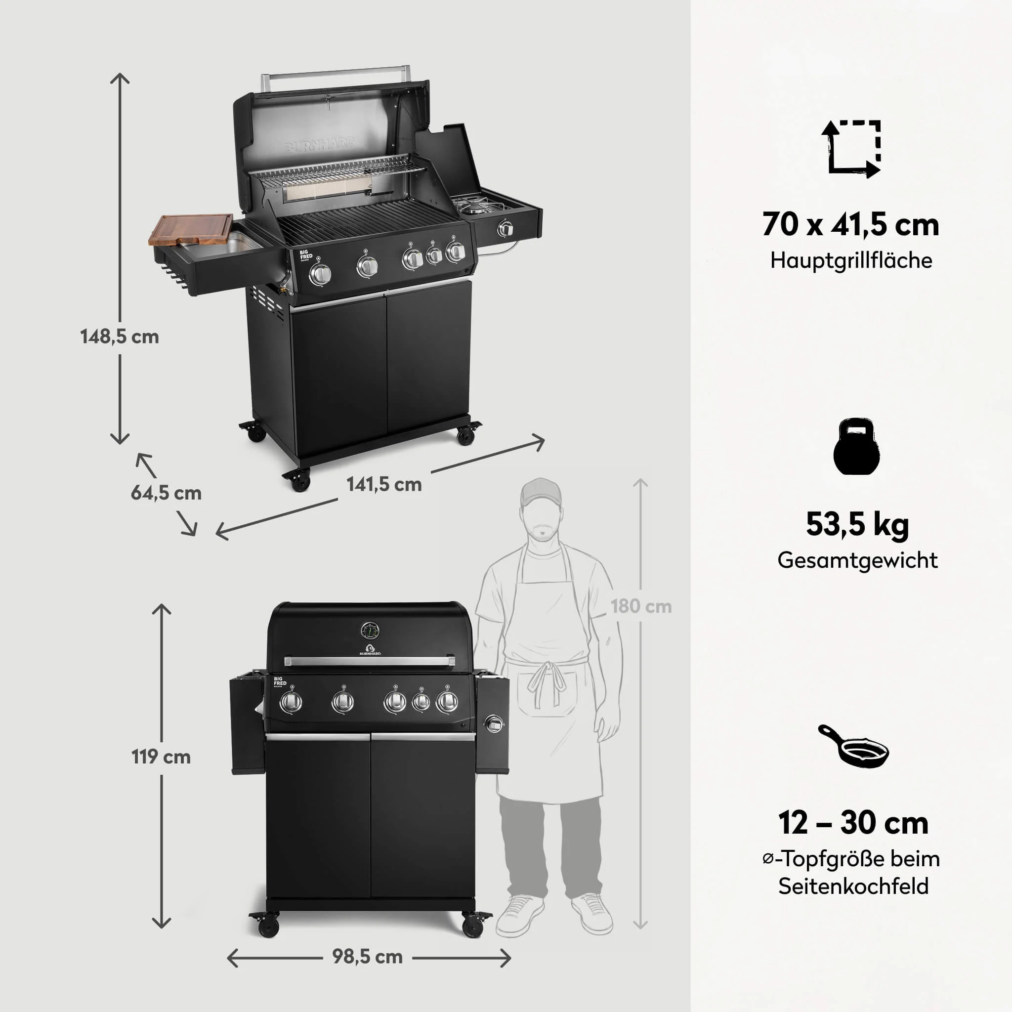 Der BURNHARD Big FRED Deluxe Gasgrill 4 Brenner Series 4 in der Black Edition mit Gusseisen Grillrost ist die perfekte Wahl für alle die maximale Leistung und volle Ausstattung für große BBQ Sessions suchen. Mit kraftvollen Brennern Infrarot Technik und einer besonders großen Grillfläche wird dieser Grill zur vollwertigen Outdoor Küche für ambitionierte Griller.