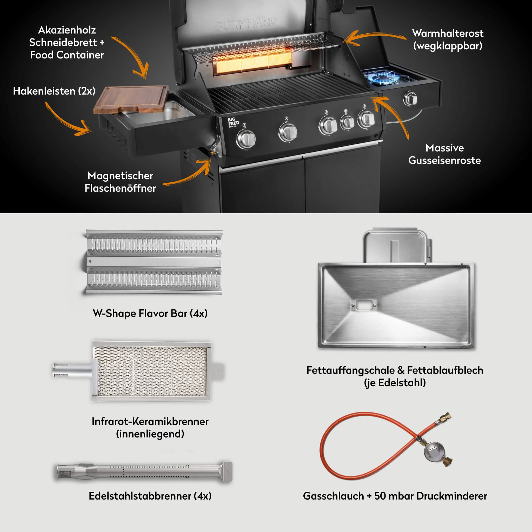 Produktinformationen "BURNHARD Big FRED Deluxe Gasgrill 4 Brenner Series 4 Black Edition mit Gusseisen Grillrost Maximale BBQ Power 21,2 kW Premium Ausstattung"