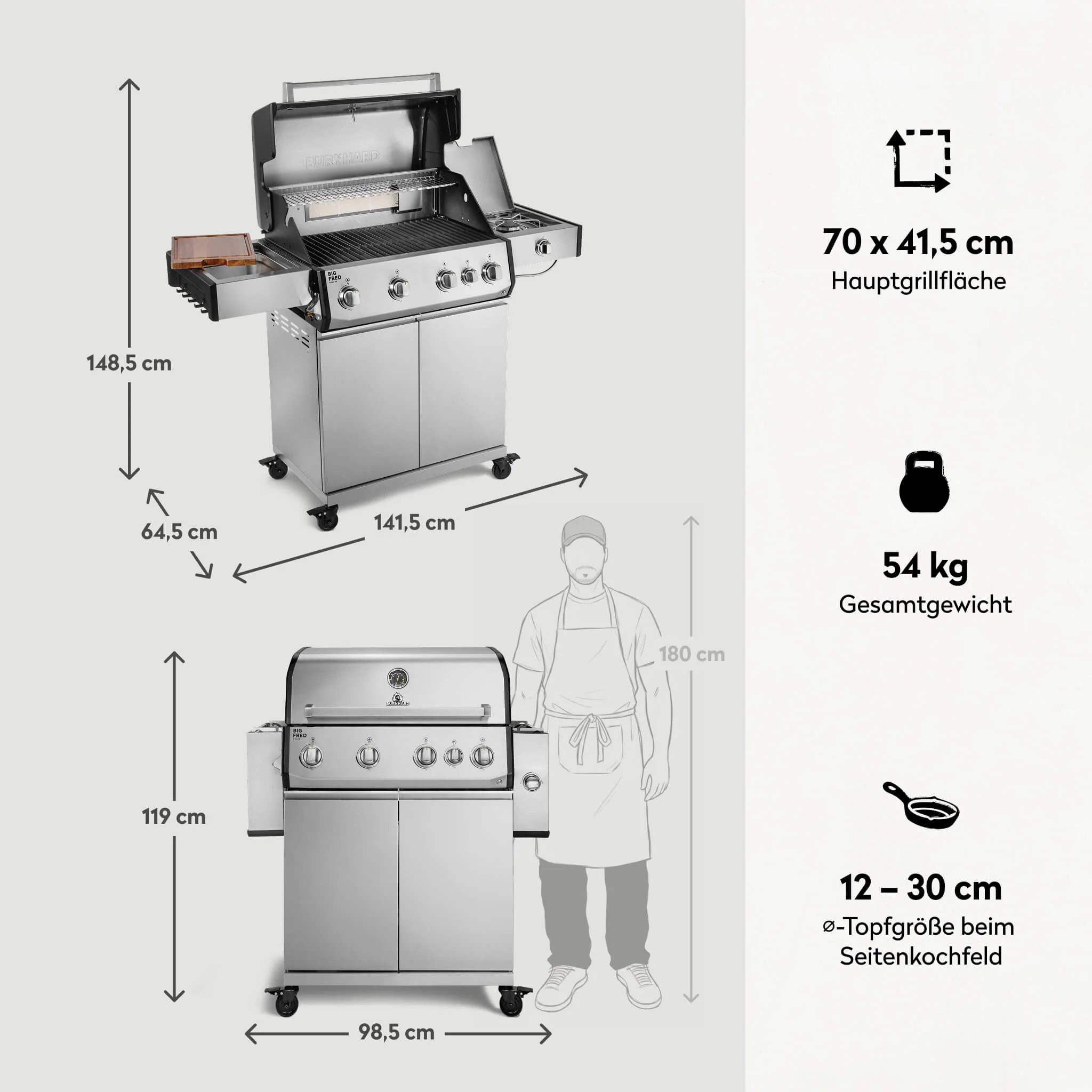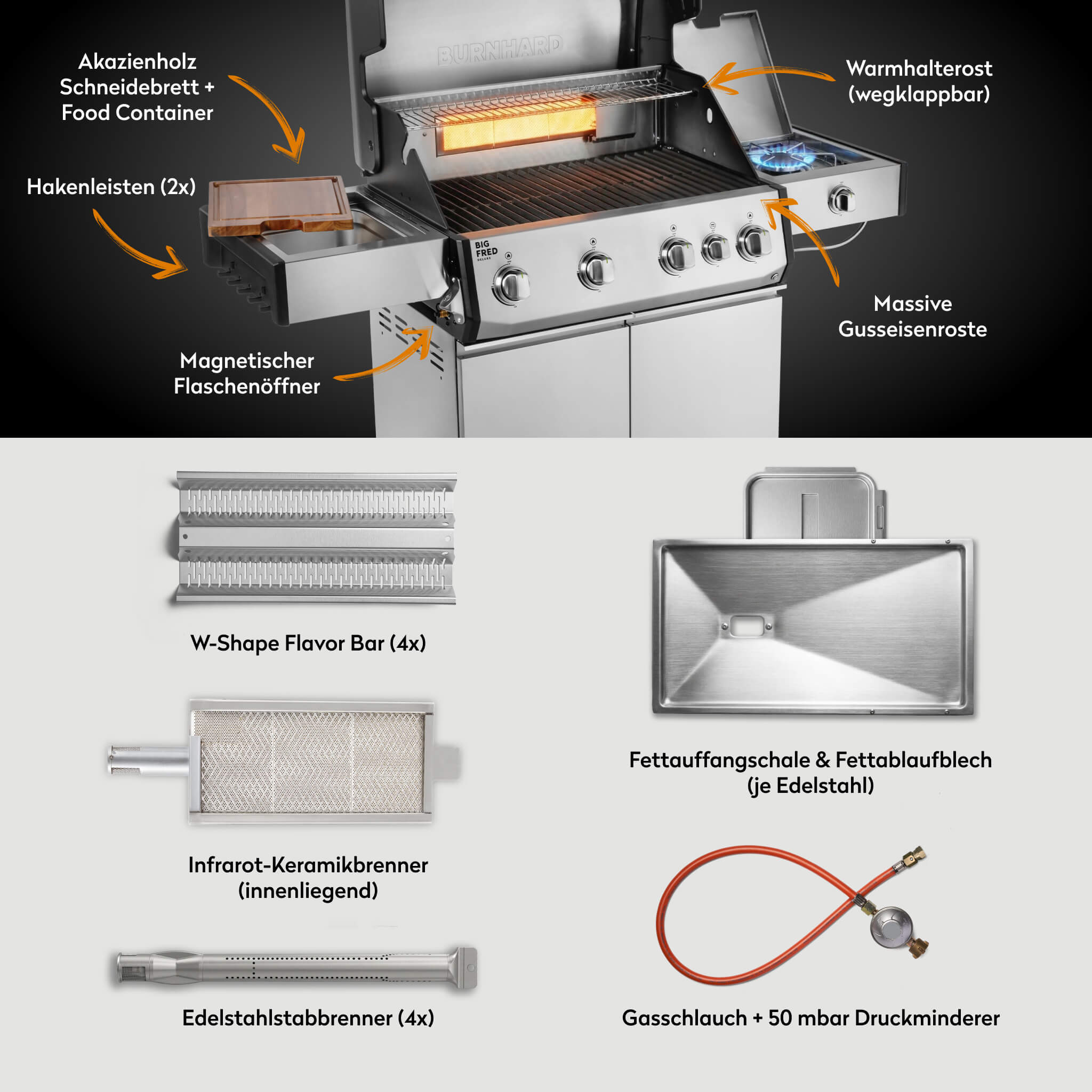 BURNHARD Big FRED Deluxe Gasgrill 4 Brenner Series 4 Edelstahl Grill mit Gusseisen Grillrost Maximale BBQ Power 21,2 kW Premium Ausstattung
