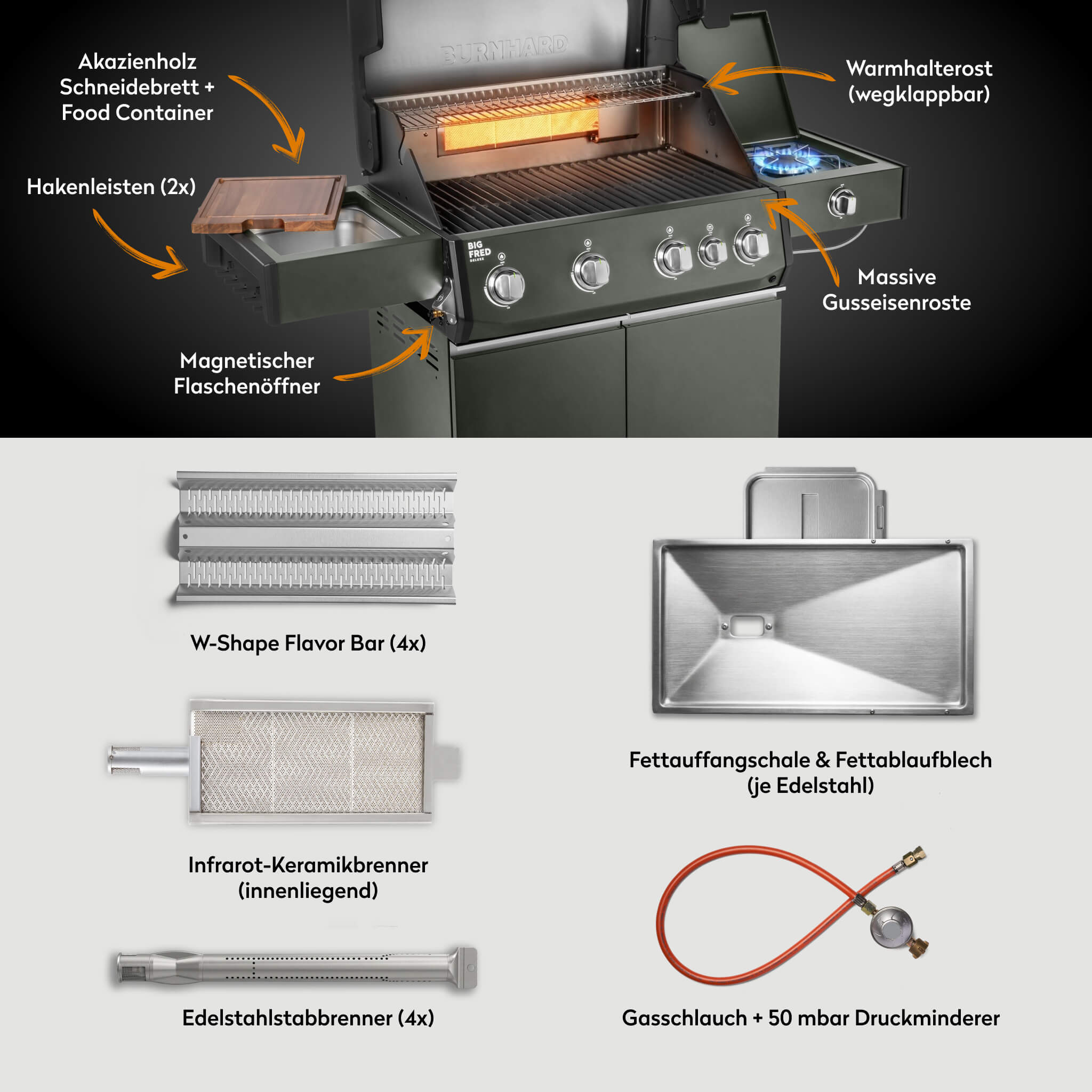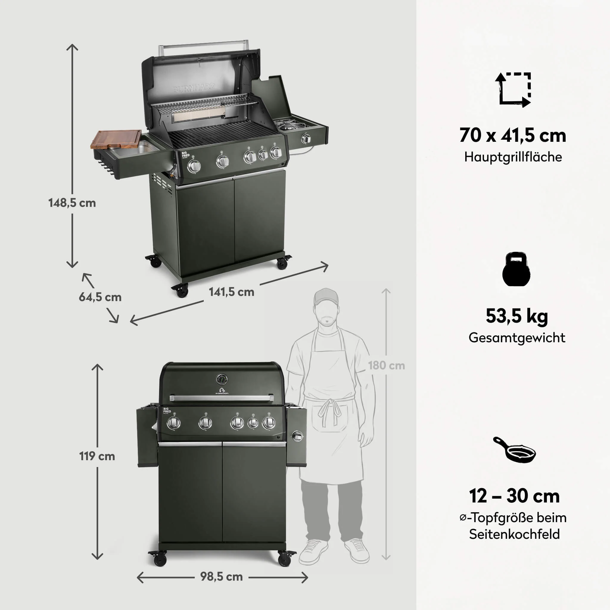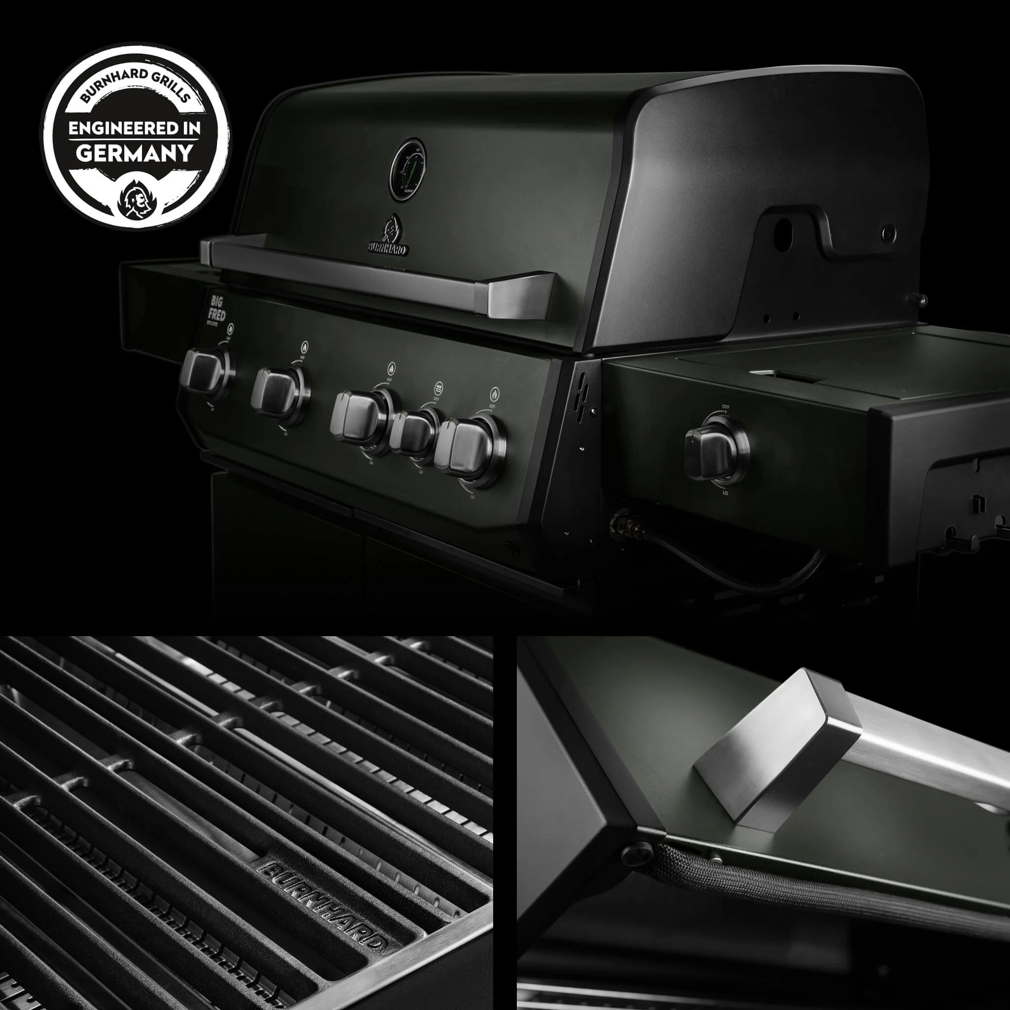 Produktinformationen "BURNHARD Big FRED Deluxe Gasgrill 4 Brenner Series 4 Green Edition mit Gusseisen Grillrost Maximale BBQ Power 21,2 kW Premium Ausstattung"