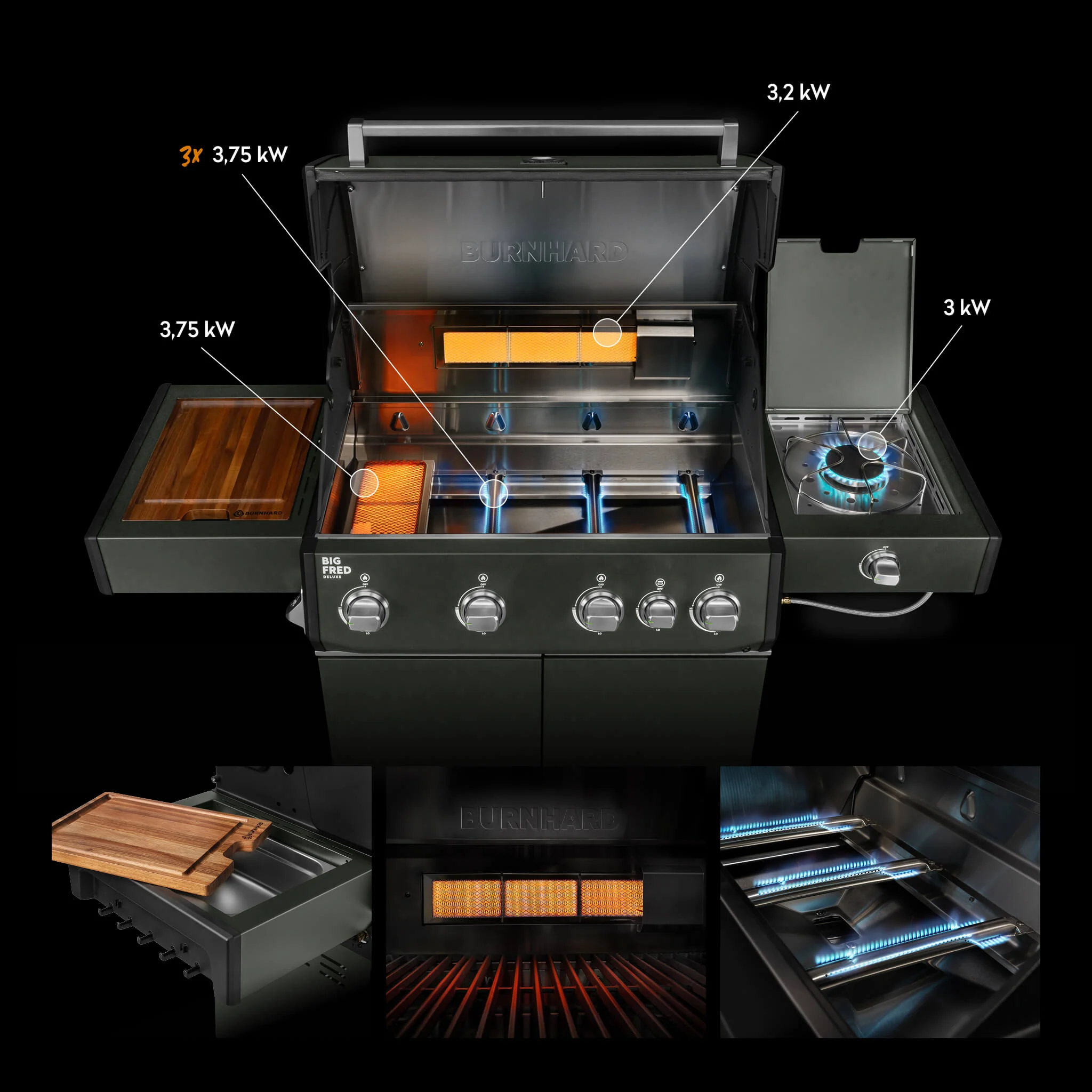 Der Big FRED Deluxe bietet dir ein leistungsstarkes Setup aus drei Edelstahl Stabbrennern mit jeweils 3,75 kW einem Infrarot Keramikbrenner mit 3,75 kW einem Infrarot Keramikheckbrenner mit 3,2 kW sowie einem Seitenkochfeld mit 3,0 kW. Mit dieser Gesamtleistung von 21,2 kW erreichst du maximale Hitze für direktes Grillen indirektes Garen und Rotisserie Anwendungen.