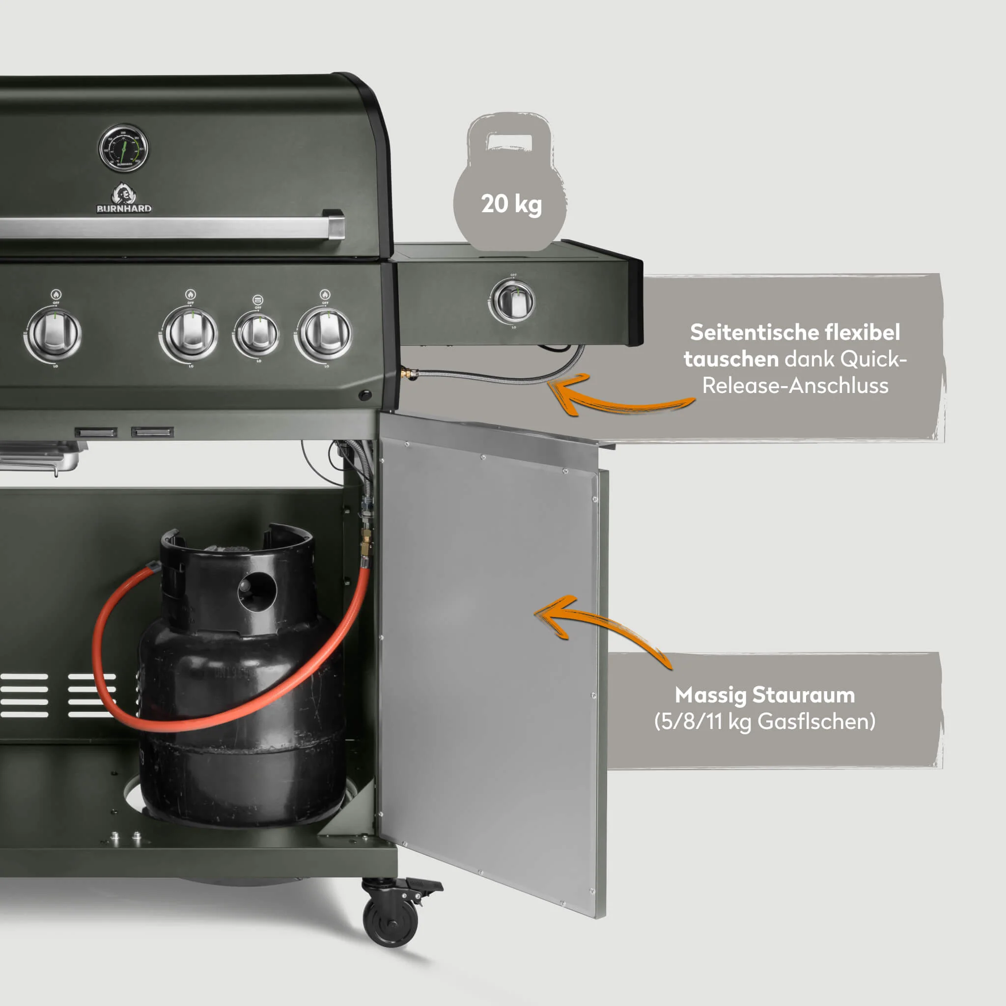 Der BURNHARD Big FRED Deluxe Gasgrill 4 Brenner Series 4 in der Green Edition mit Gusseisen Grillrost verbindet maximale Leistung mit einer besonderen und modernen Farboptik. Die robuste Pulverbeschichtung in Grün sorgt für einen echten Hingucker im Garten während die leistungsstarke Technik und hochwertige Ausstattung echtes BBQ auf Profi Niveau ermöglichen. Entwickelt für große Grillrunden und anspruchsvolle Grillfans.