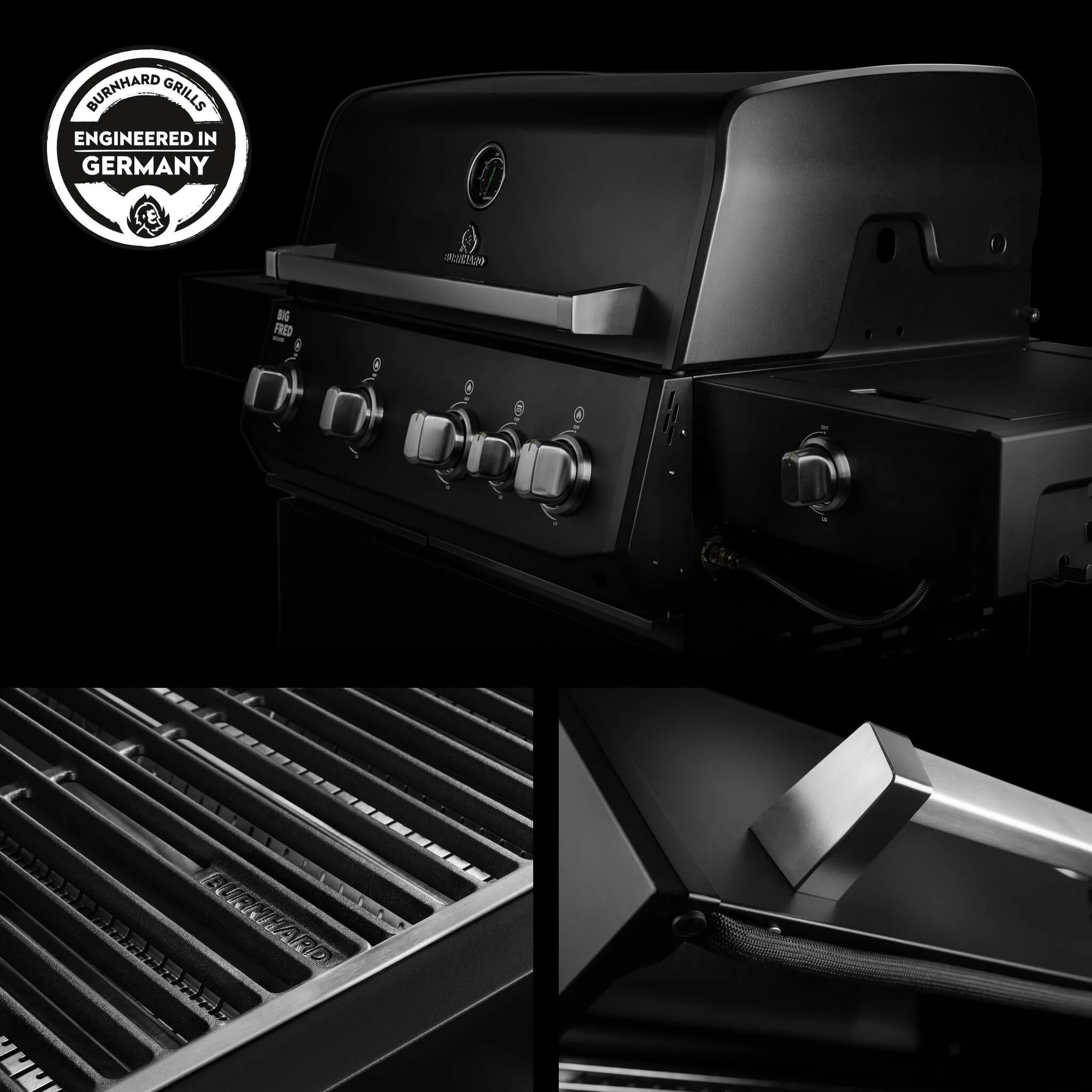 Der BURNHARD Big FRED Deluxe Plus Gasgrill 4 Brenner Series 4 Black Edition mit Gusseisen Grillrost ist ein High End Gasgrill für höchste Ansprüche. Maximale Leistung große Grillfläche und Premium Ausstattung machen ihn zur perfekten Wahl für alle die kompromissloses BBQ auf Profi Niveau wollen.