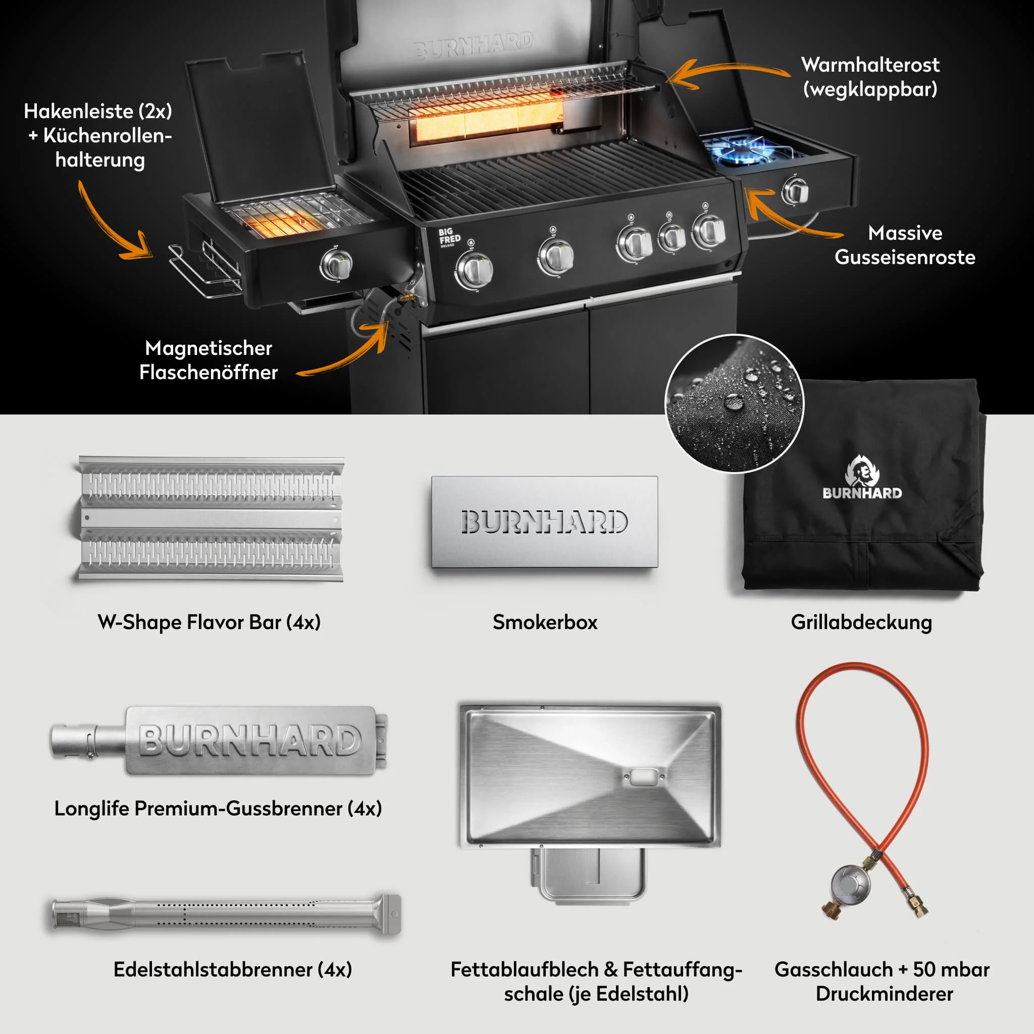 Produktinformationen "BURNHARD Big FRED Deluxe Plus Gasgrill 4 Brenner Series 4 Black Edition mit Gusseisen Grillrost Maximale BBQ Power 24,7 kW Premium Ausstattung"