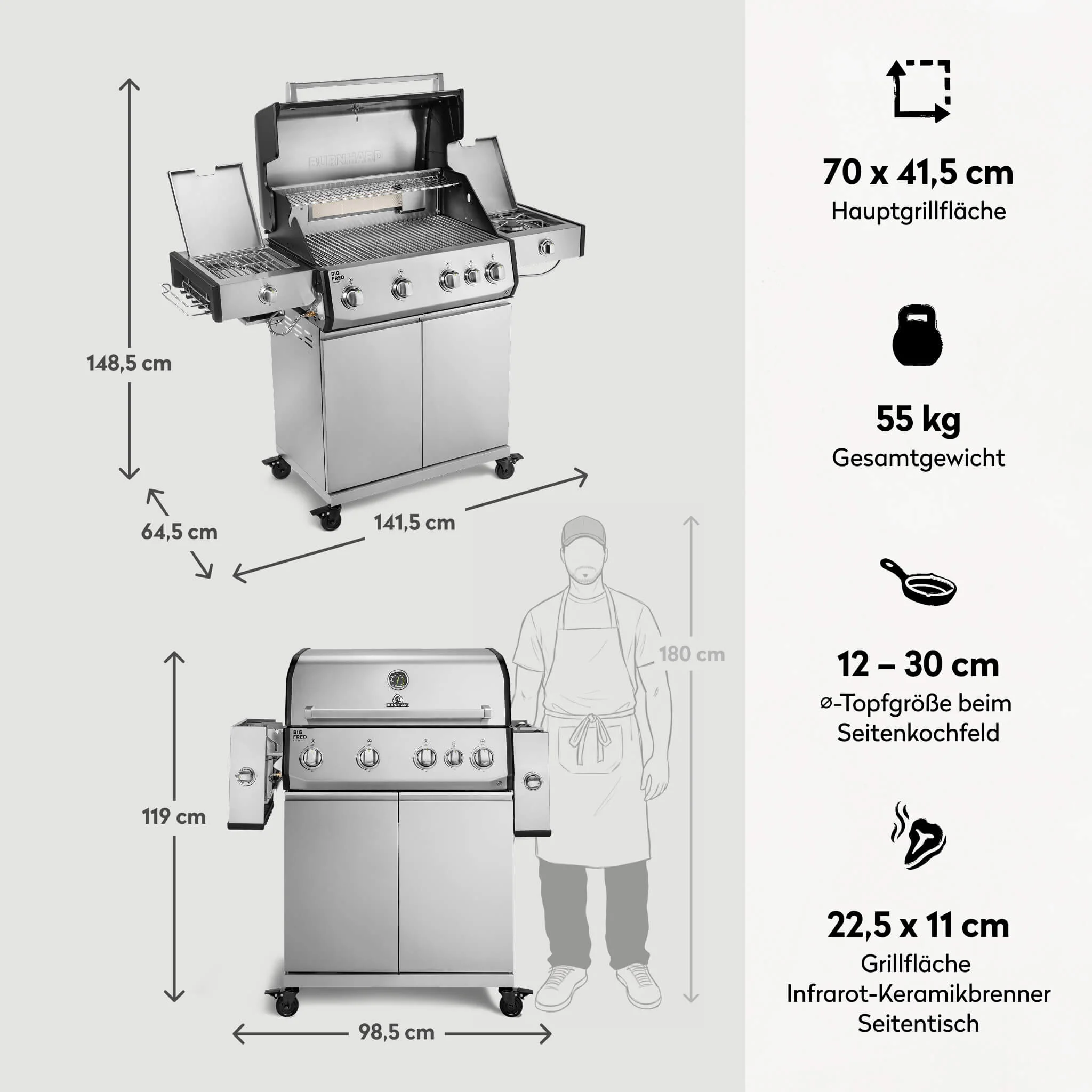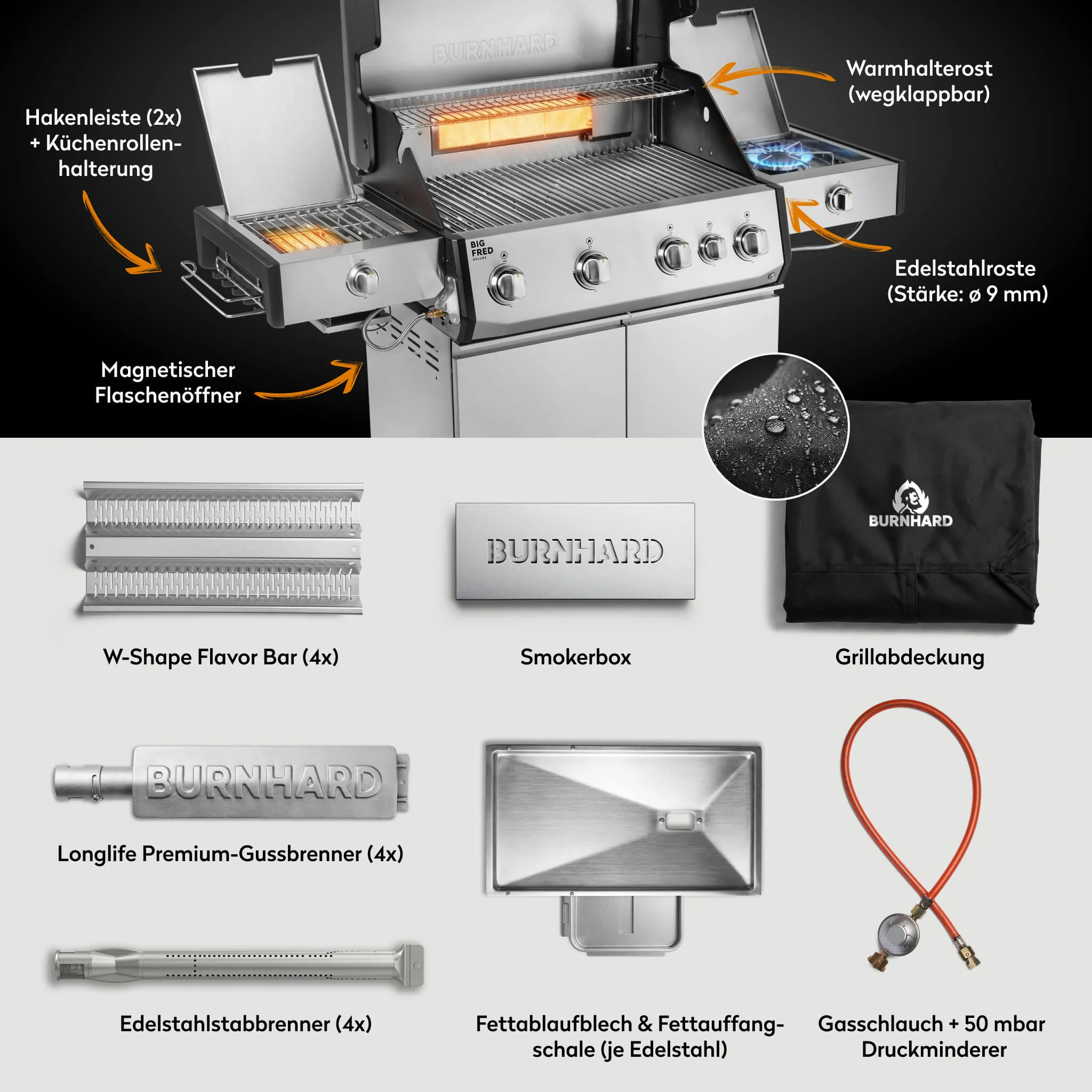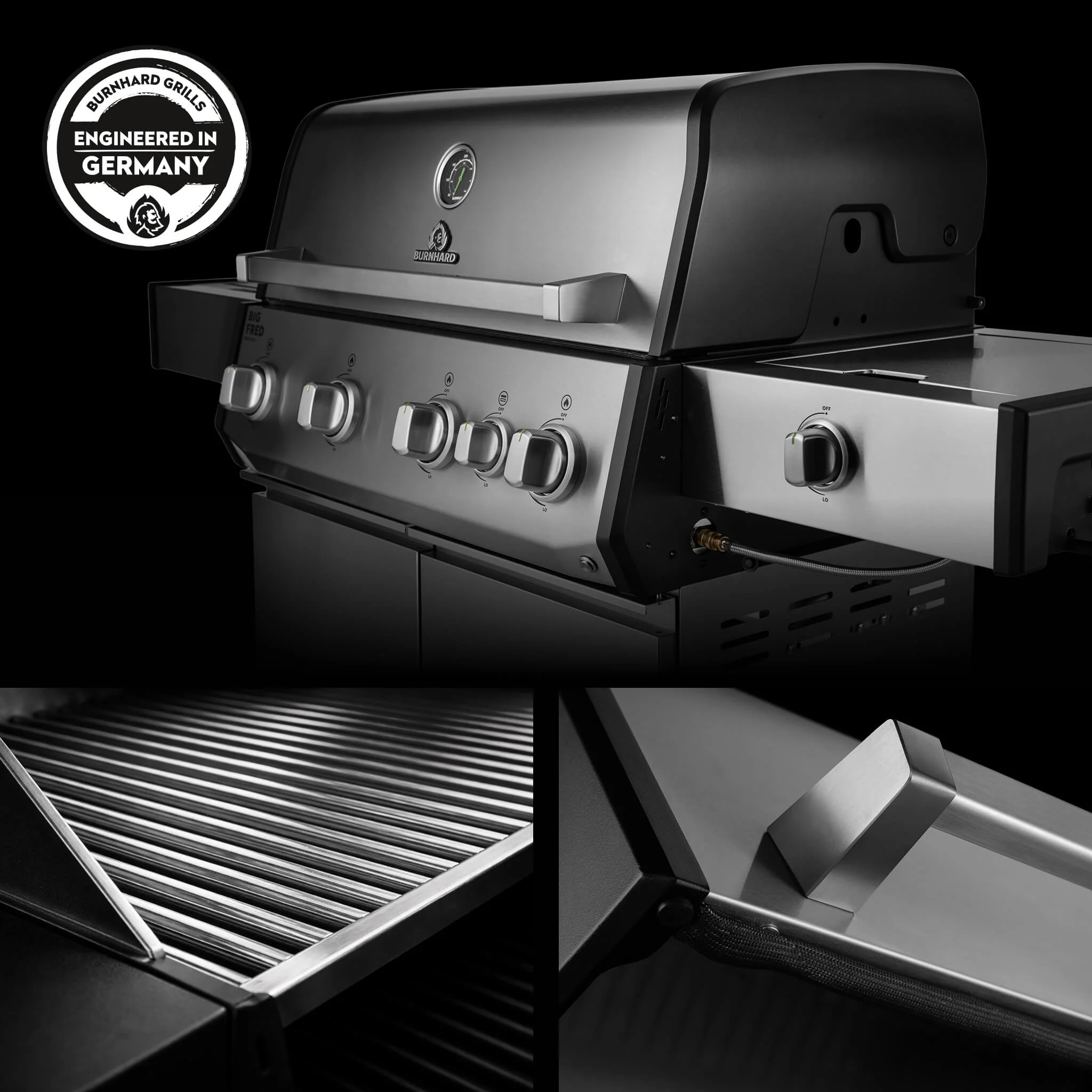 Der BURNHARD Big FRED Deluxe Plus Gasgrill 4 Brenner Series 4 Edelstahl Grill mit Edelstahl Grillrost ist ein High End Gasgrill für höchste Ansprüche. Maximale Leistung langlebige Materialien und pflegeleichte Ausstattung machen ihn zur perfekten Wahl für große Grillrunden und kompromissloses BBQ auf Profi Niveau.