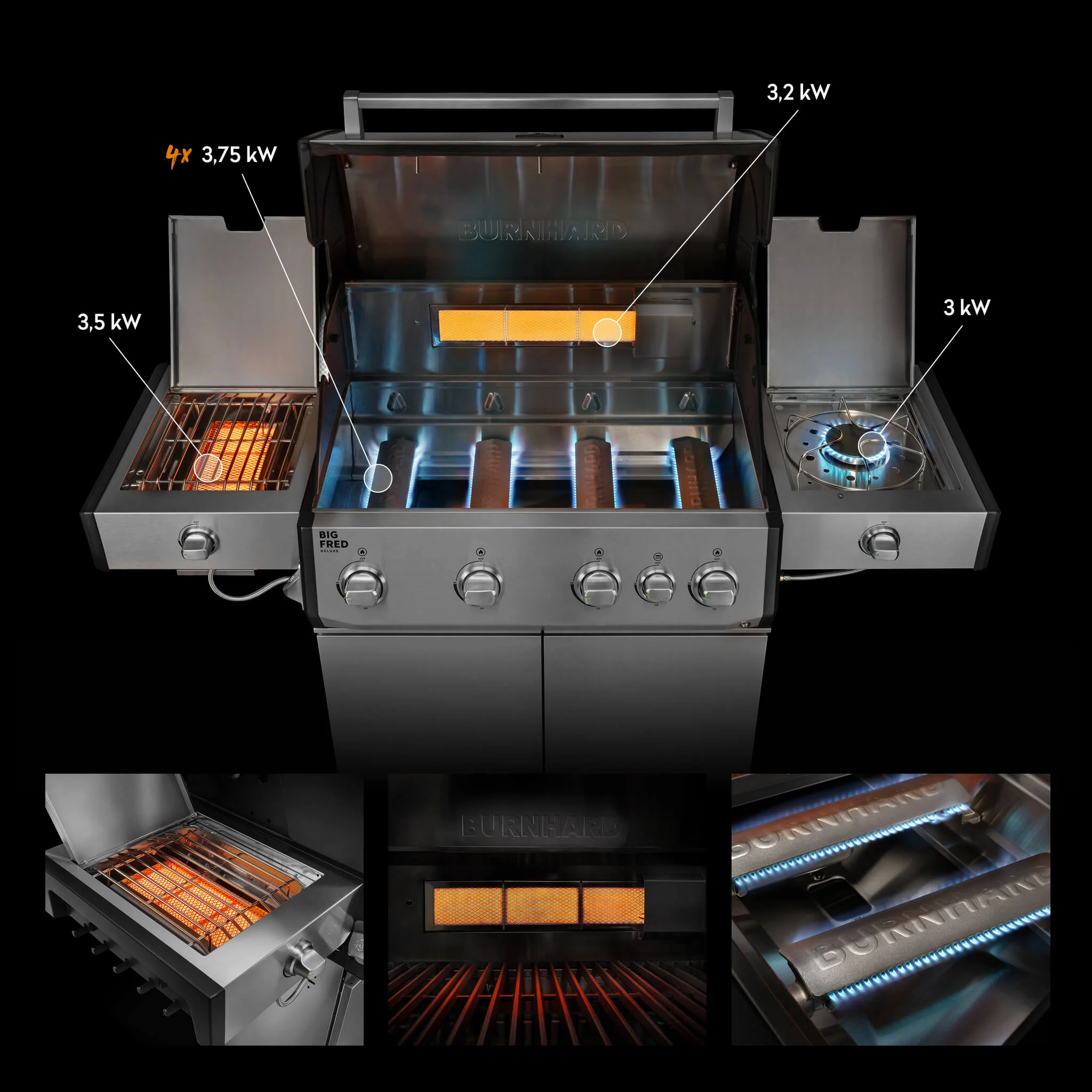 Produktinformationen "BURNHARD Big FRED Deluxe Plus Gasgrill 4 Brenner Series 4 Edelstahl Grill mit Edelstahl Grillrost Maximale BBQ Power 24,7 kW Premium Ausstattung"