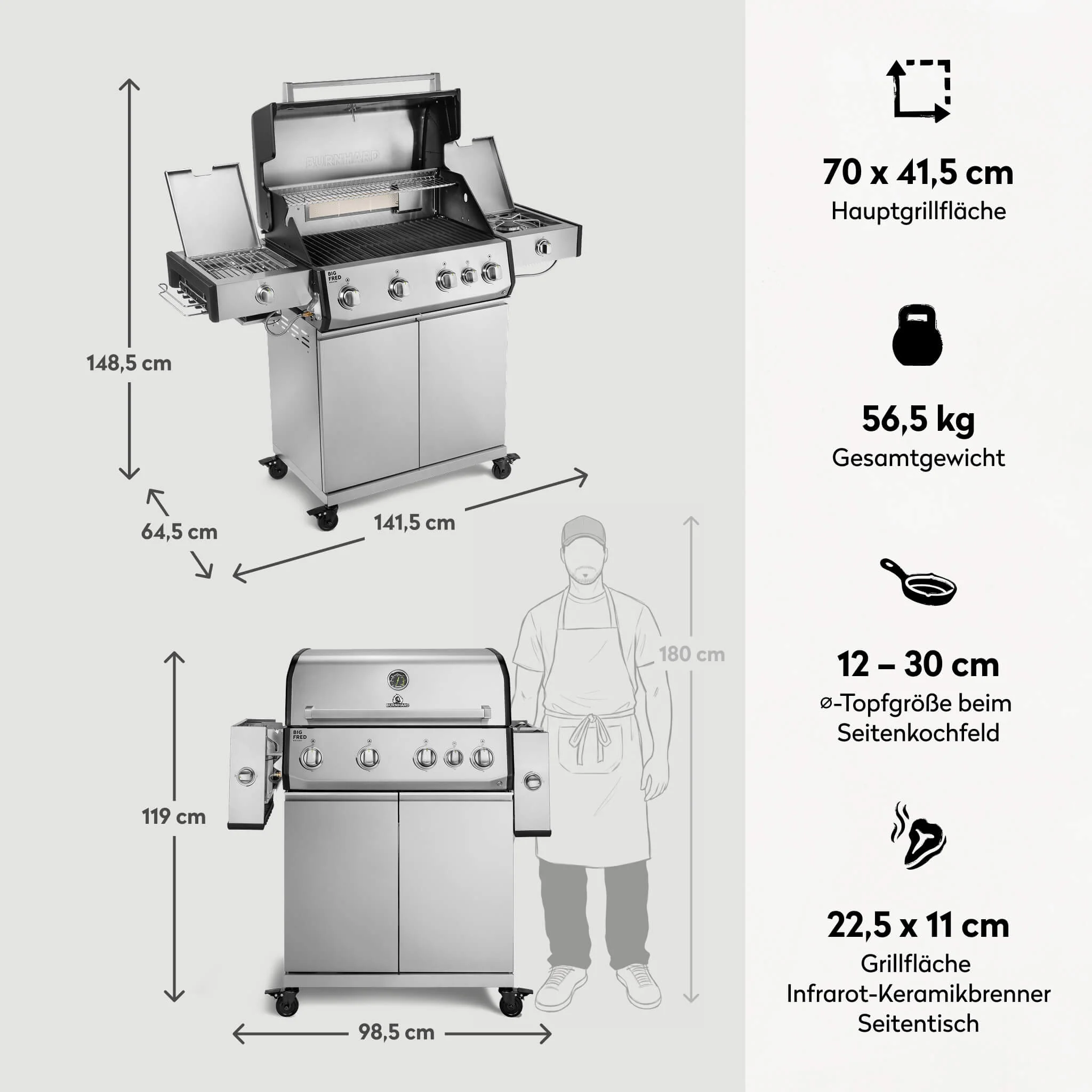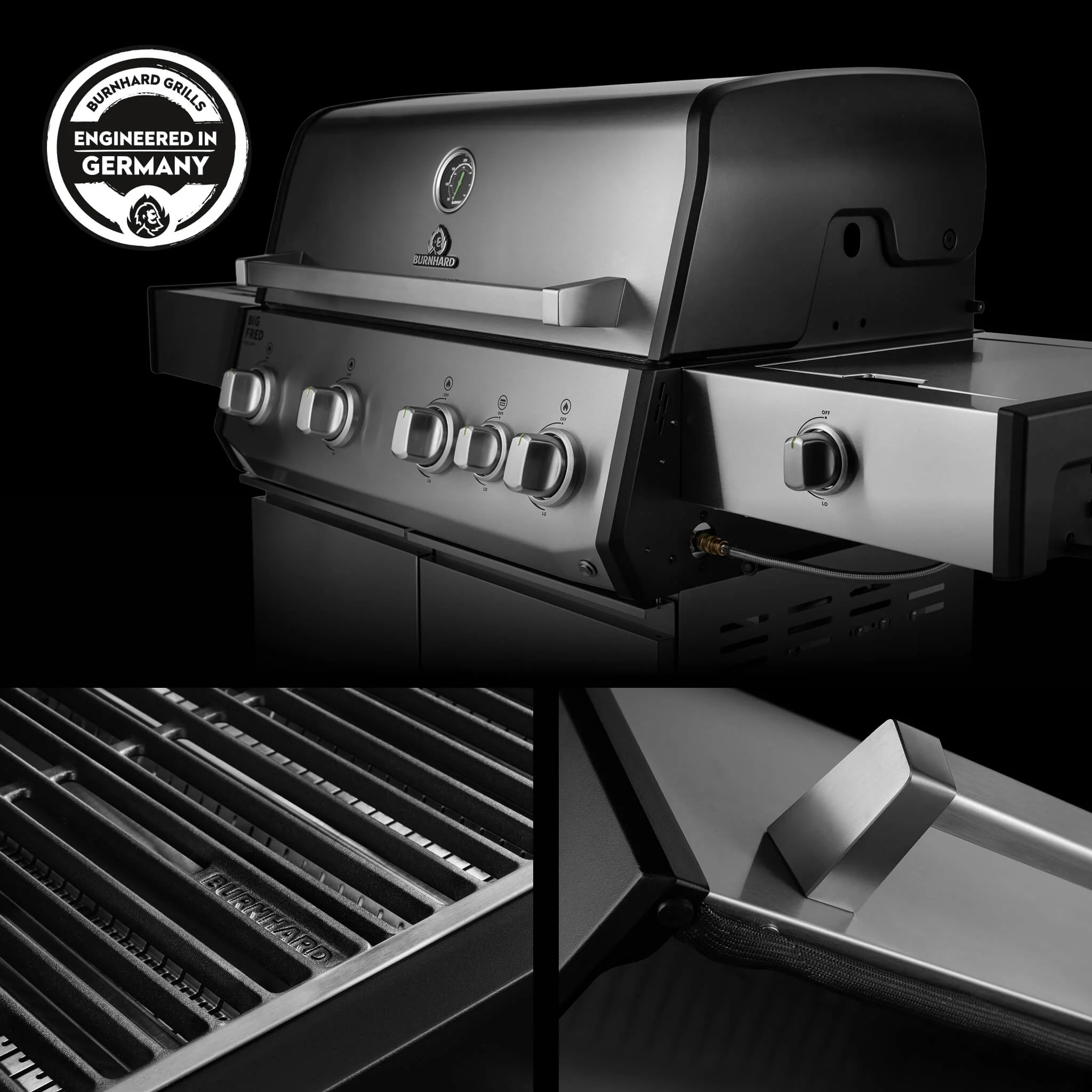 Produktinformationen "BURNHARD Big FRED Deluxe Plus Gasgrill 4 Brenner Series 4 Edelstahl Grill mit Gusseisen Grillrost Maximale BBQ Power 24,7 kW Premium Ausstattung"