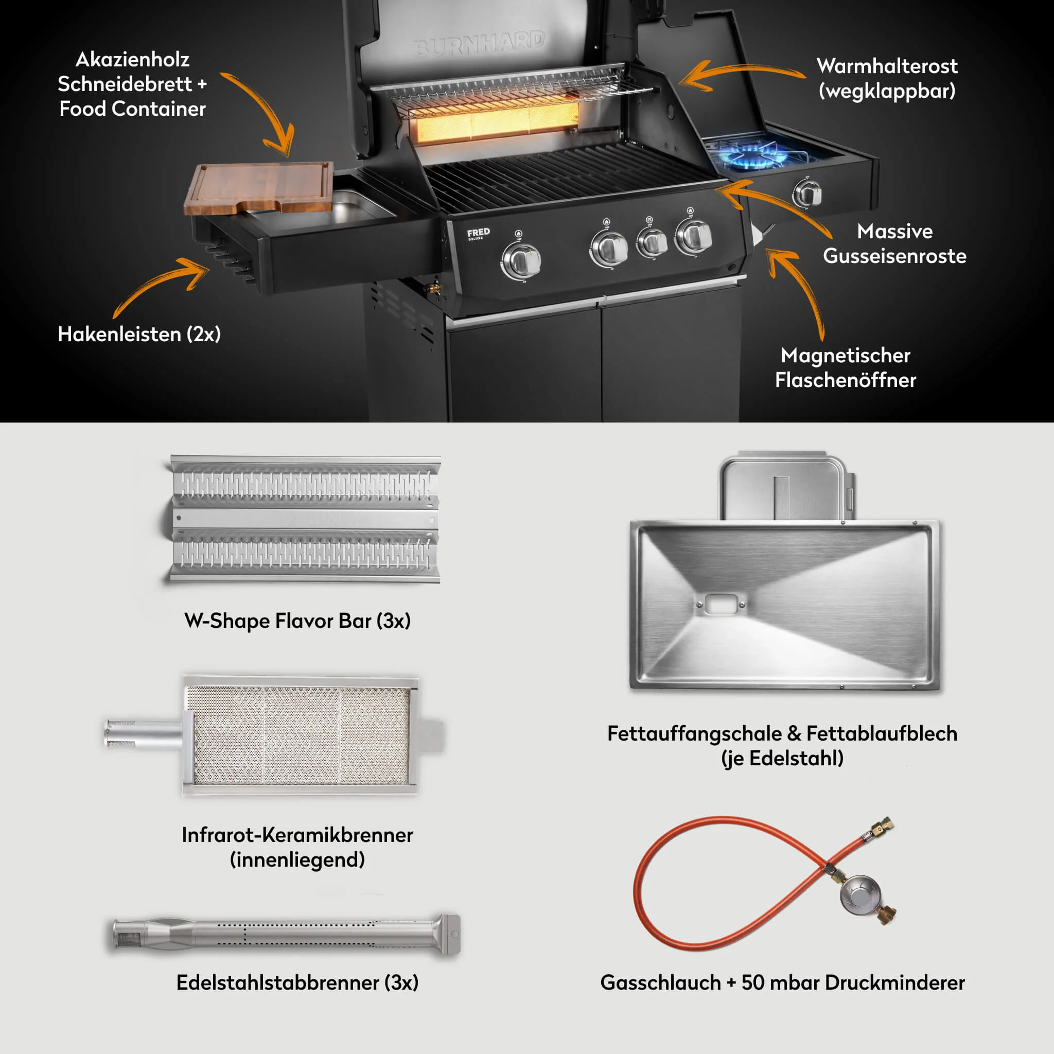 Produktinformationen "BURNHARD FRED Deluxe Gasgrill 3 Brenner Series 4 Black Edition mit Gusseisenrost Maximale BBQ Power vielseitig modern"