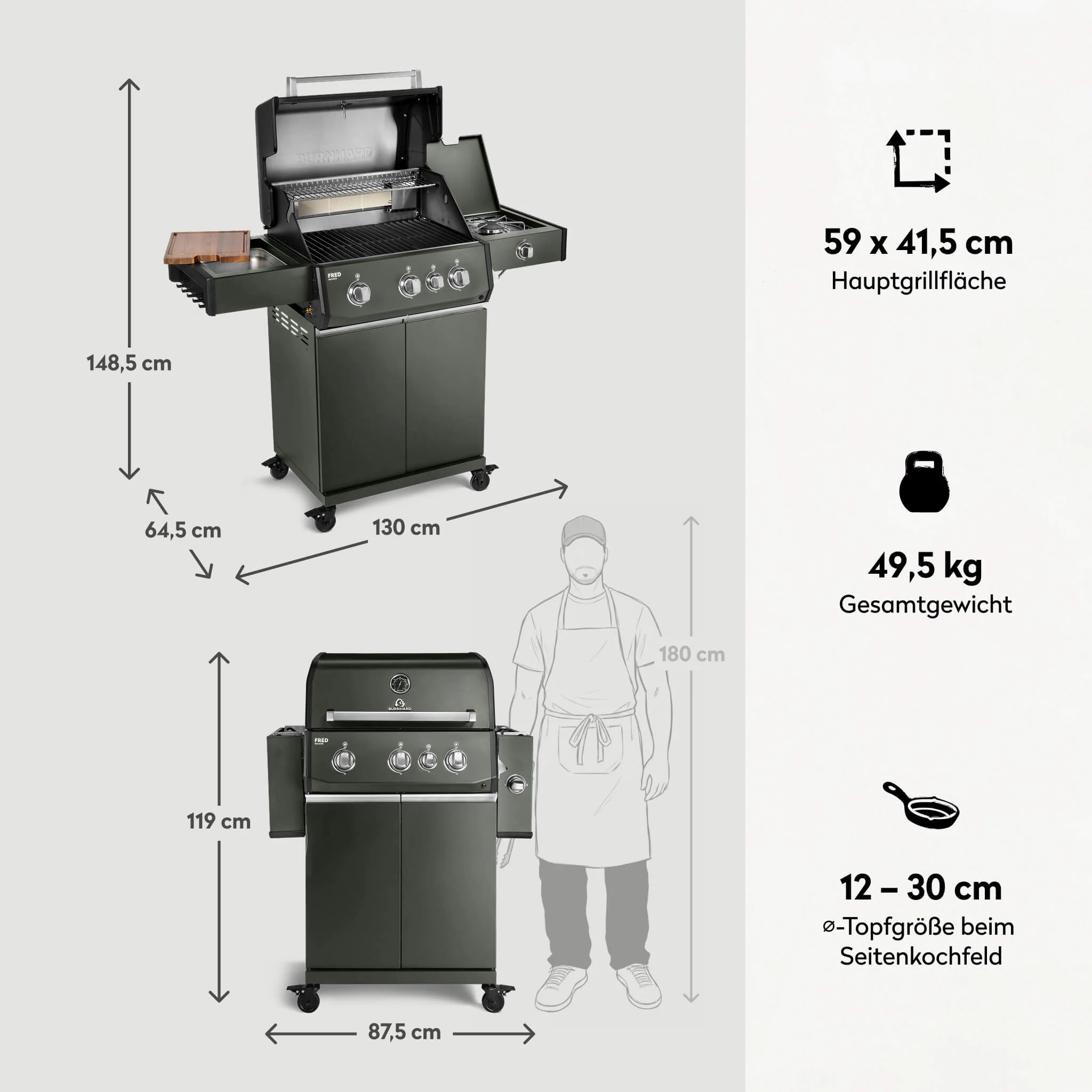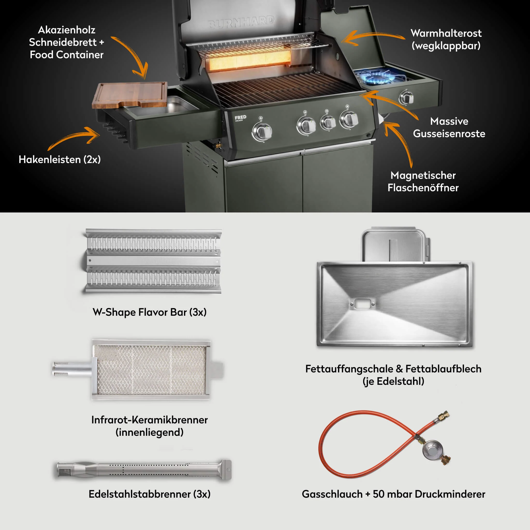 Produktinformationen "BURNHARD FRED Deluxe Gasgrill 3 Brenner Series 4 Green Edition mit Gusseisenrost Maximale BBQ Power modern nachhaltig"