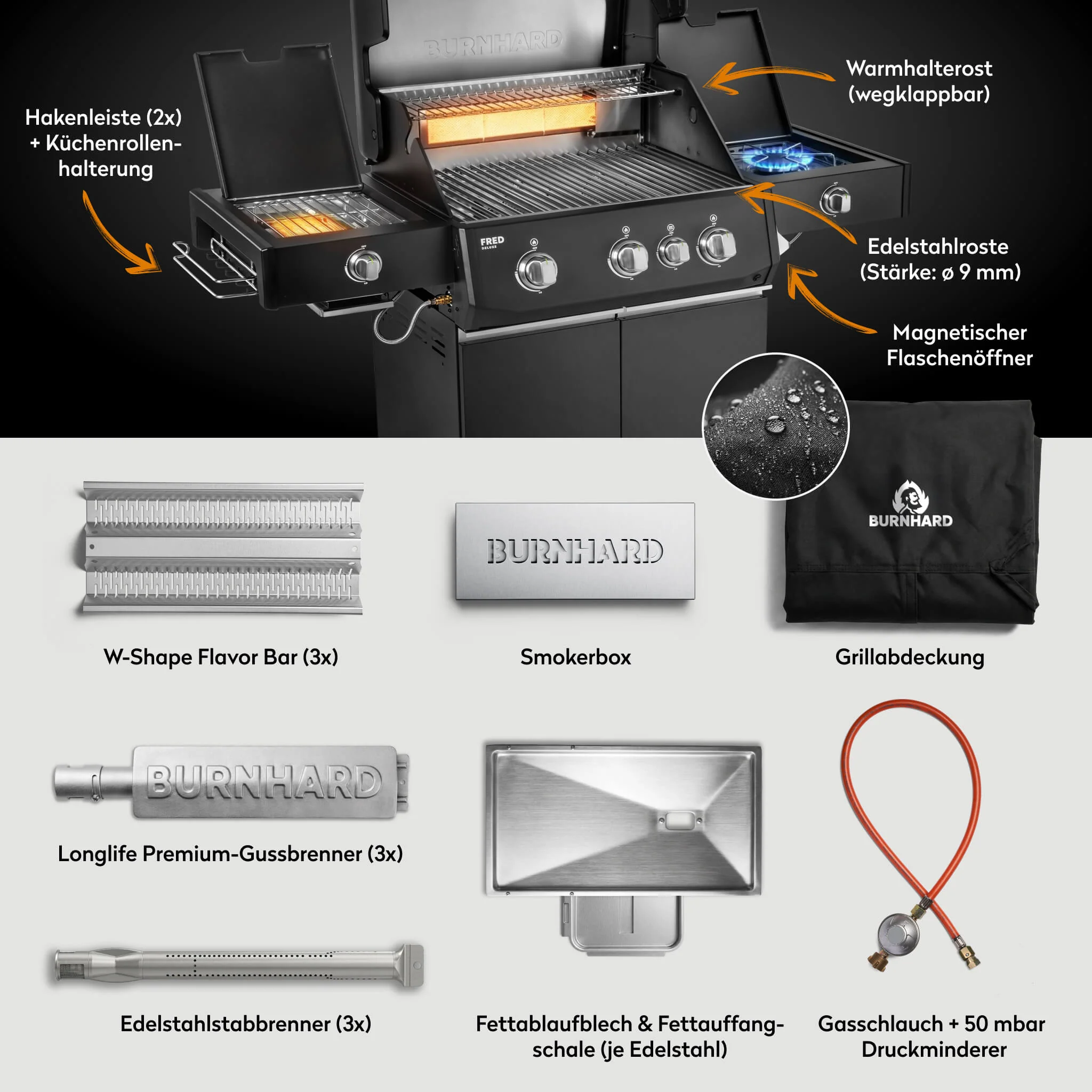 Der BURNHARD FRED Deluxe Plus Gasgrill 3 Brenner Series 4 Black Edition mit Edelstahl Grillrost ist ein High End Gasgrill für höchste Ansprüche. Extreme Leistung vielseitige Brennerzonen und pflegeleichte langlebige Materialien machen ihn zur perfekten Wahl für alle die kompromissloses BBQ auf Profi Niveau wollen.