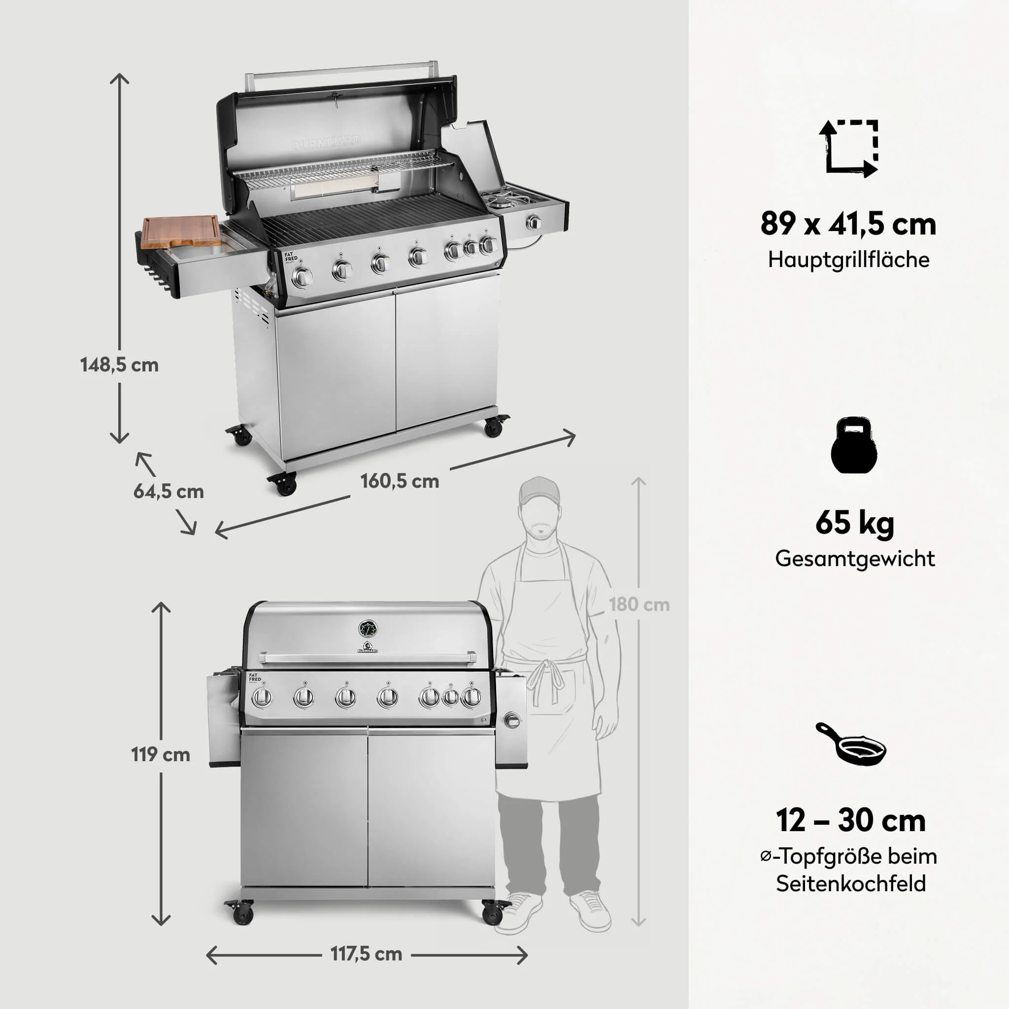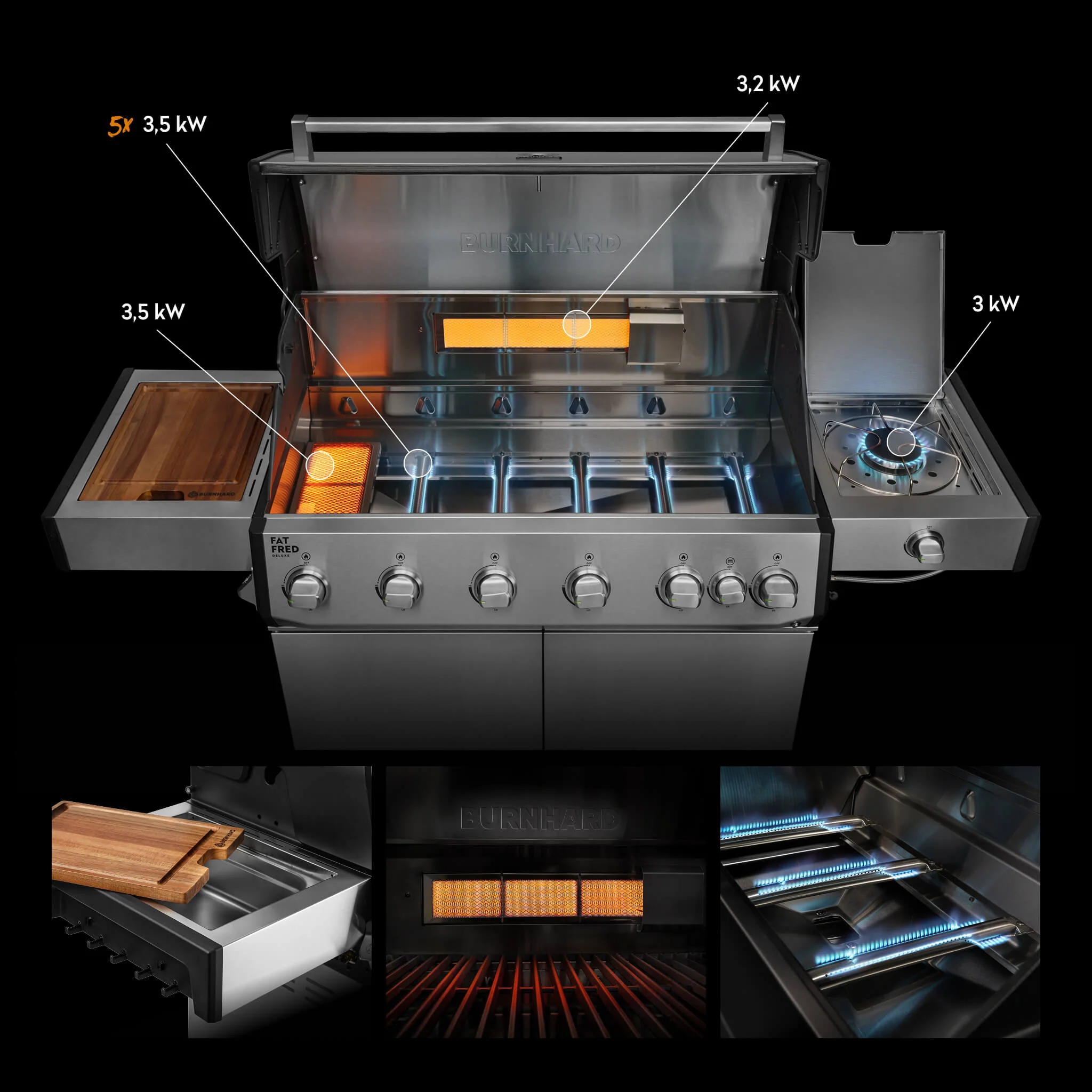 Produktinformationen "BURNHARD Fat FRED Deluxe Gasgrill 6 Brenner Series 4 Edelstahl Grill mit Gusseisen Grillrost Maximale BBQ Power 27,2 kW XXL Grillfläche"