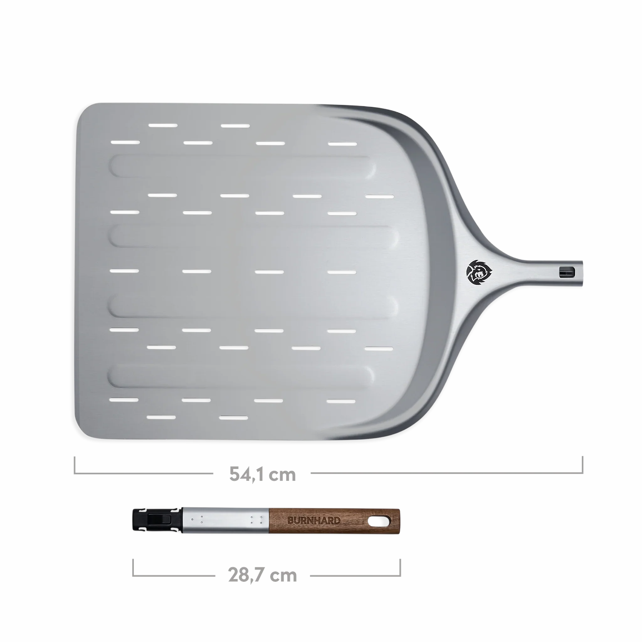 Mit dem BURNHARD Pizza-Set 2‑teilig erhältst du perfekt kompatible Tools für deinen FAT TONY Gas-Pizzaofen: einen perforierten Pizzaschieber und einen flexiblen Pizzawender. Beide Geräte erleichtern das Handling direkt im kompakten, hochtemperaturfähigen Pizzaofen.