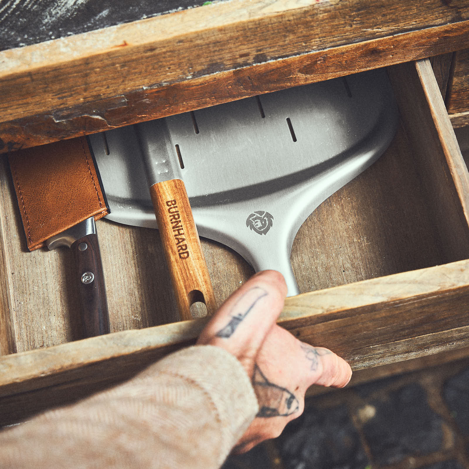 Das Set kombiniert eloxiertes Aluminium für Schieber und Wender, robuste Kunststoffteile beim Spachtel, elegantes Akazienholz-Brett und scharfes Edelstahl-Wiegemesser für blitzsauberes Schneiden. Jedes Tool wurde designed, um Hitze zu widerstehen und beständig zu sein - perfekt geeignet für den heißen, engen Backraum deinem FAT TONY.