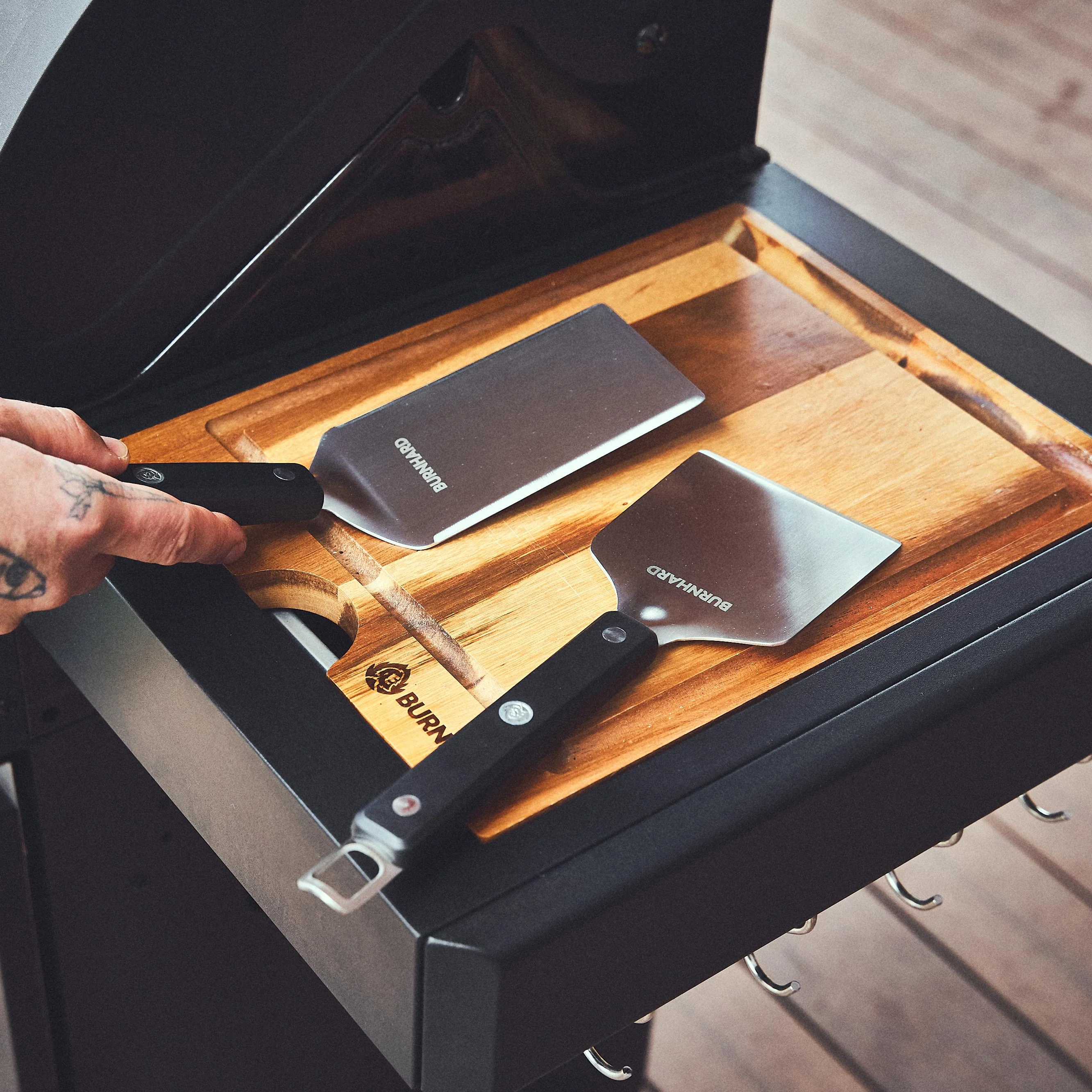 Das 2‑teilige Plancha‑Set von BURNHARD ist maßgeschneidert für die kleinere Grillfläche von 41,5 × 23,5 cm - perfekt geeignet zum Wenden von Gemüse, Eiern, Pommes oder Burgern direkt auf der Planchafläche, ohne dass etwas durch das Rost fällt.